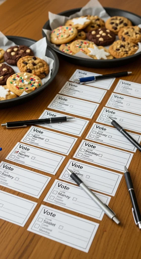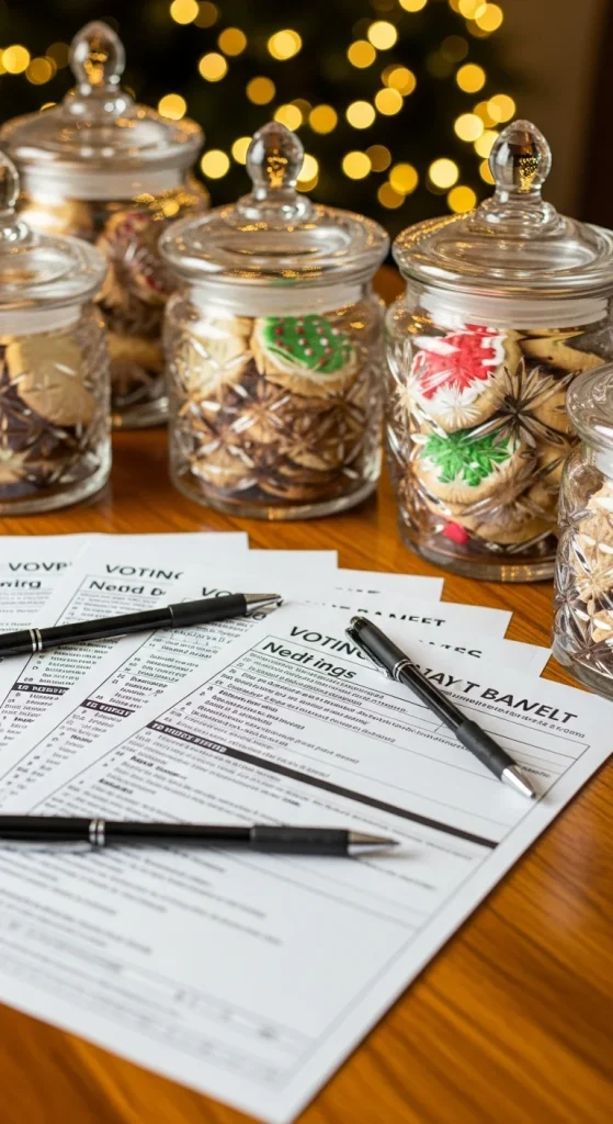 Ballots help guests choose favourites fairly. Print small ballots with multiple categories. Collect them in a jar or basket. Use simple black-and-white printing if you’re saving money. Keep the ballots small so you can fit multiple on a page. This gives your cookie exchange a fun competitive element.