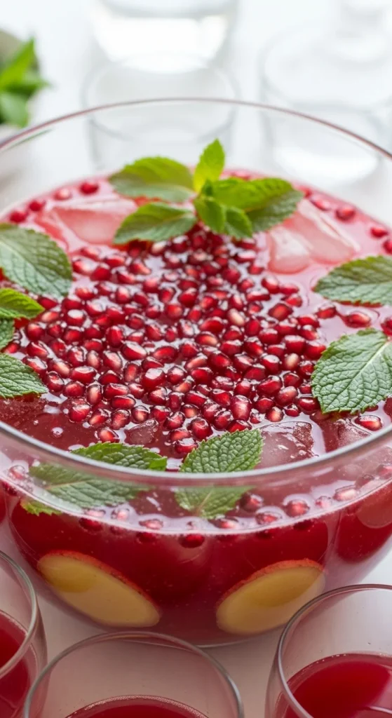 Pomegranate Ginger Punch combines the sweet and tart flavors of pomegranate juice with the spiciness of ginger ale. This punch is both refreshing and flavorful, and it’s a wonderful addition to any holiday celebration. Garnish with pomegranate seeds and fresh mint for a festive touch, and serve chilled for a crisp, invigorating mocktail option.