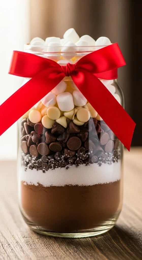 Combine cocoa powder, sugar, and chocolate chips in a jar. Add marshmallows on top and tie with festive ribbon. Include a tag with directions: “Mix 3 tablespoons with hot milk.” It’s rich, simple, and loved by all ages. Perfect for gifting in bulk — affordable and cozy.