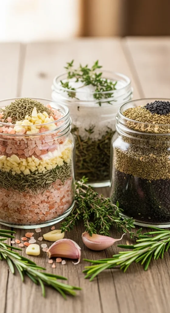Blend coarse salt with dried rosemary, garlic powder, and thyme. Store in small jars. Use it on meats, eggs, or roasted veggies. Add custom labels to personalize each jar.