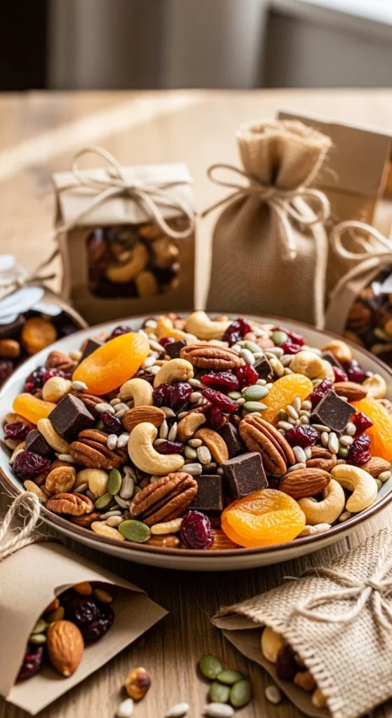 Mix nuts, seeds, and dried fruits with a few chocolate chips. Divide into small bags or jars. Add a label that says “Energy for the holidays.” Healthy, crunchy, and quick to make.