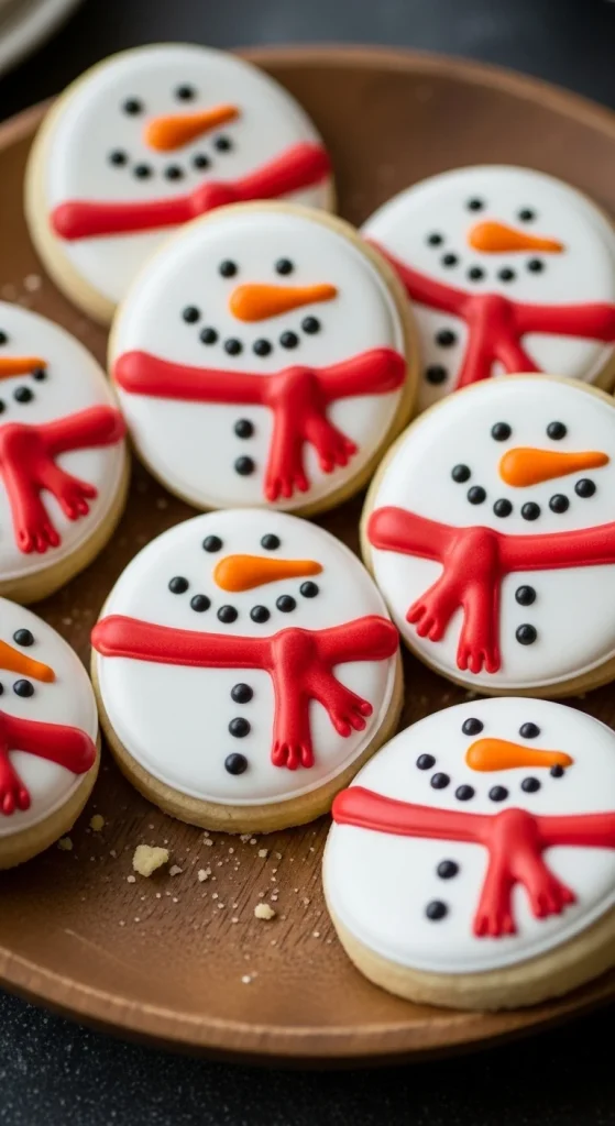 Make friendly snowmen using white icing and colorful scarves made from fondant strips. Use mini chocolate chips for eyes and mouth. It’s a cheerful design that brings personality to every cookie.