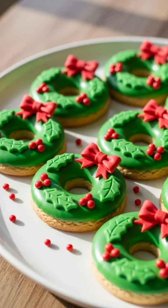 Pipe green icing in small leafy motions to mimic a wreath. Add red sprinkle “berries” and finish with a small bow. Hang them on cookie trees or wrap them in clear bags for gifting — pretty and festive.