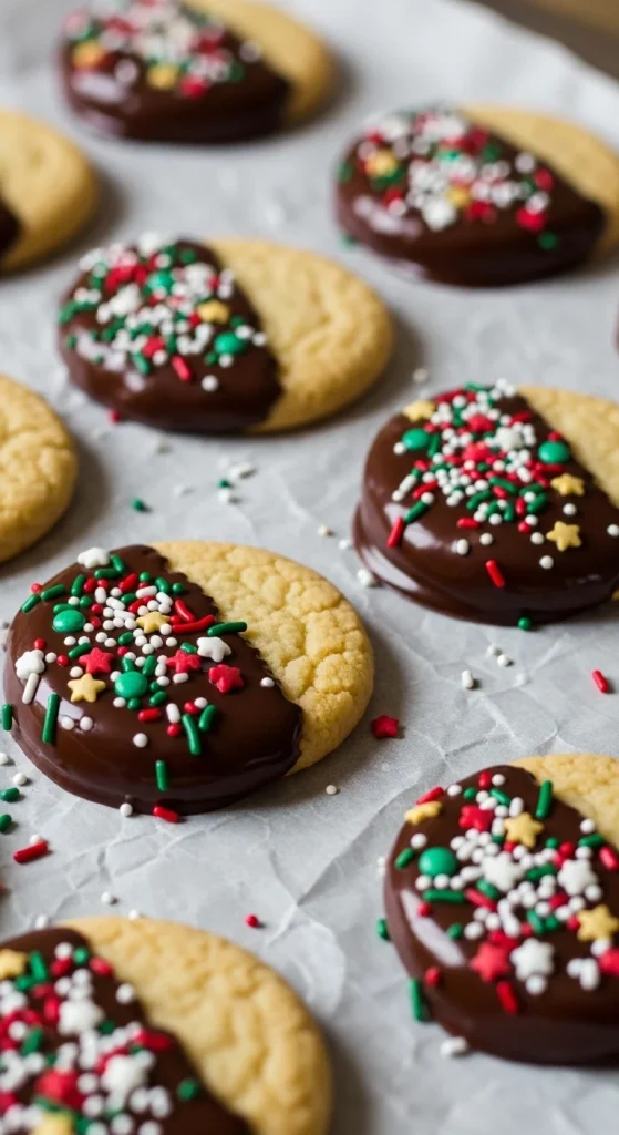 Dip half of each cookie in melted chocolate, then press into a bowl of festive sprinkles. Chill for a few minutes to set. They look professional but take minutes to make. A budget-friendly way to decorate large batches.