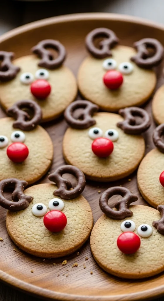 Turn plain cookies into adorable reindeer. Use pretzels for antlers, red M&Ms for noses, and white icing for eyes. Rudolph cookies are always a hit with kids. Easy to assemble and perfect for parties or classroom treats.