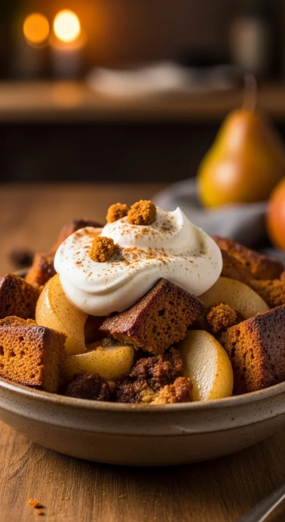 Pear and gingerbread bread pudding is a cozy, spiced dessert that’s perfect for the holidays. The pears add a juicy sweetness, while the gingerbread spices give the pudding a festive kick. Top with whipped cream for a rich and indulgent finish.