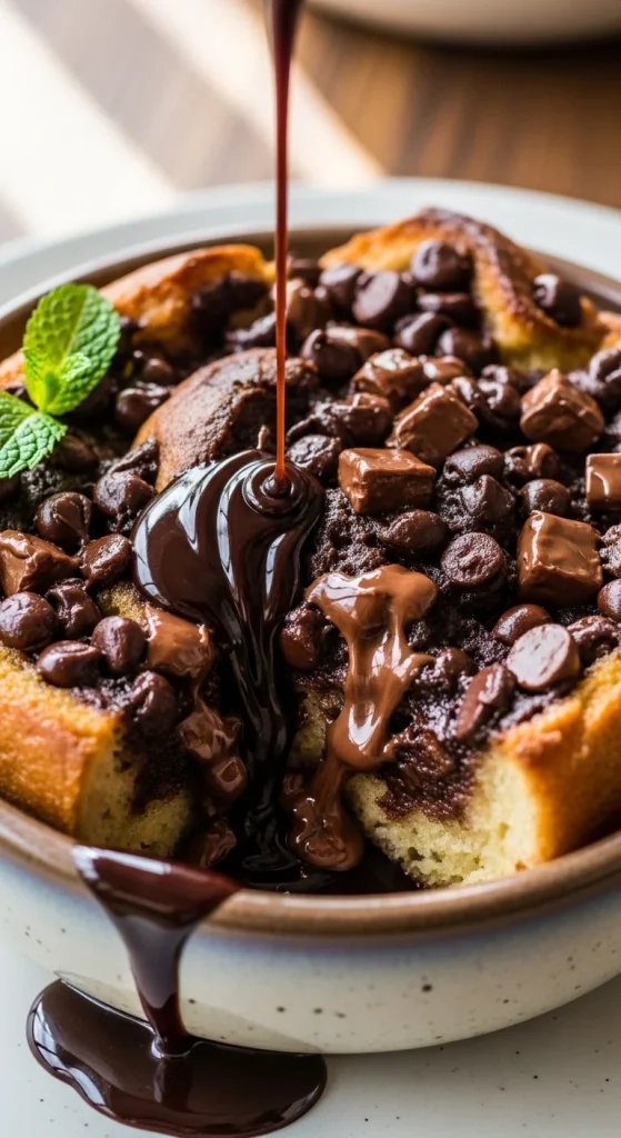 Chocolate hazelnut bread pudding is the ultimate treat for chocolate lovers. The combination of chocolate chips and hazelnuts creates a rich, nutty flavor that pairs perfectly with the custard base. A drizzle of chocolate syrup completes this indulgent dessert.