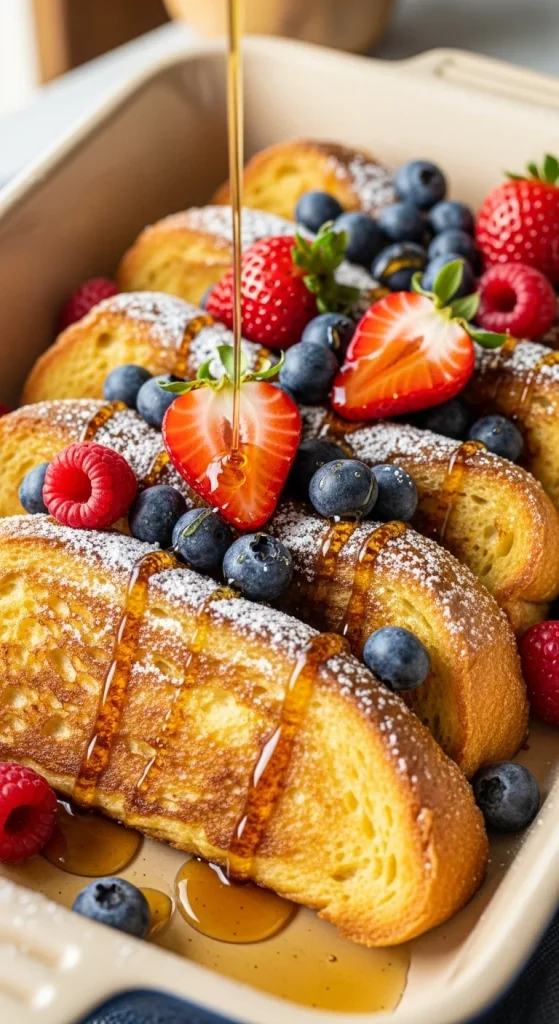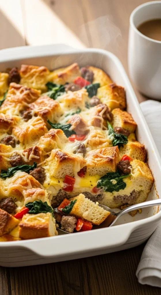 This one-pan breakfast makes feeding a crowd easy. Layer bread, sausage, cheese, and eggs, then bake until bubbly. It’s hearty and satisfying, perfect for big family mornings. You can assemble it the night before and bake it fresh for a stress-free morning.