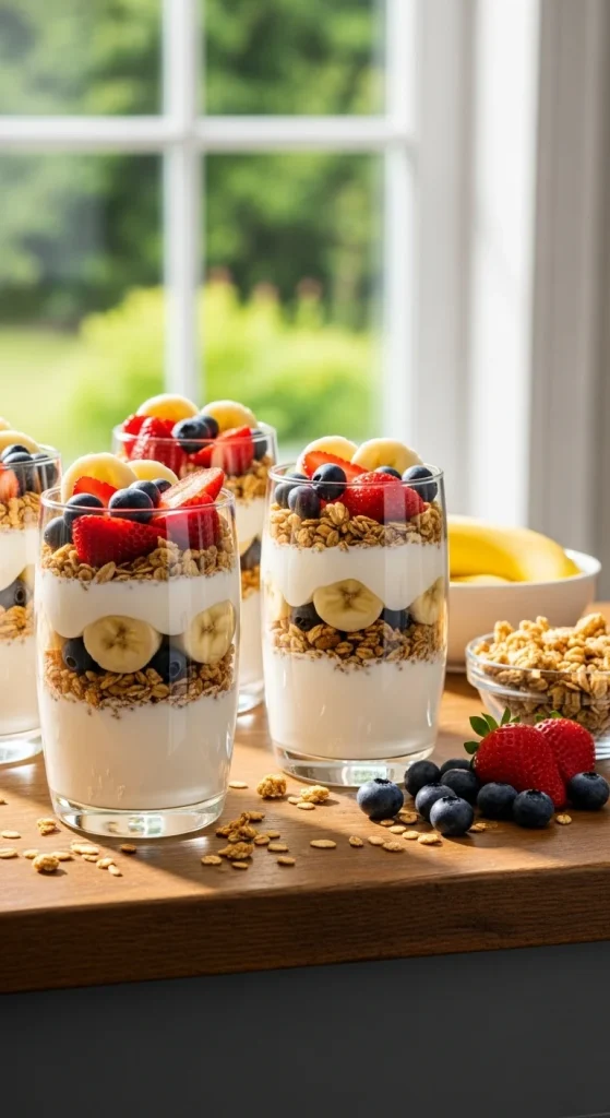Let everyone build their own parfaits. Set out yogurt, fruit, granola, and honey. It’s colorful, healthy, and mess-free. Great for families or guests who wake up at different times.