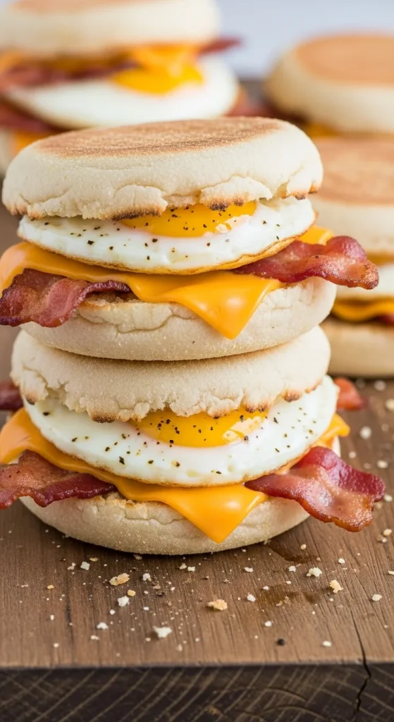 These sandwiches are simple but satisfying. Layer eggs, cheese, and bacon on toasted muffins or biscuits. Wrap extras in foil and reheat later. A portable breakfast that keeps the family happy.
