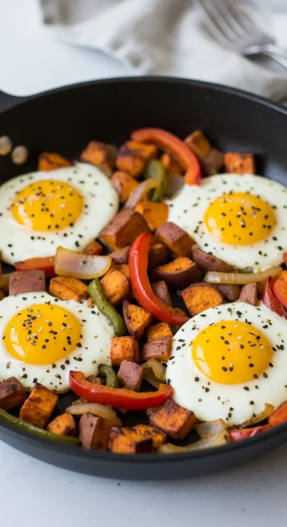 A colorful, veggie-packed breakfast that’s filling and delicious. Dice sweet potatoes and sauté with onions and peppers. Top with eggs for protein. It’s wholesome, affordable, and easy to customize.