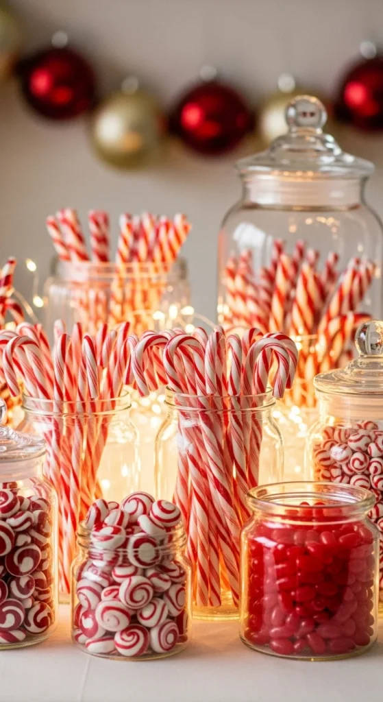 This idea creates a playful candy cane “forest.” Stand candy canes upright in foam blocks covered with white felt. Scatter peppermint bark, red swirled candies, and small pinecones around the table. For a thrifty option, buy candy canes in bulk since they’re usually very affordable. This theme gives a magical winter look without needing many items.