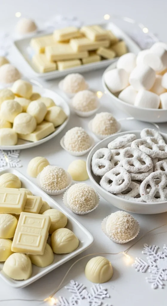A white candy buffet looks clean and wintry. Use marshmallows, white chocolate drops, yogurt pretzels, coconut truffles, and white gumballs. Add fake snow or snowflake cutouts for extra charm. One DIY trick is to make paper snowflakes and hang them behind the table. This theme photographs beautifully because of its bright and simple colours.