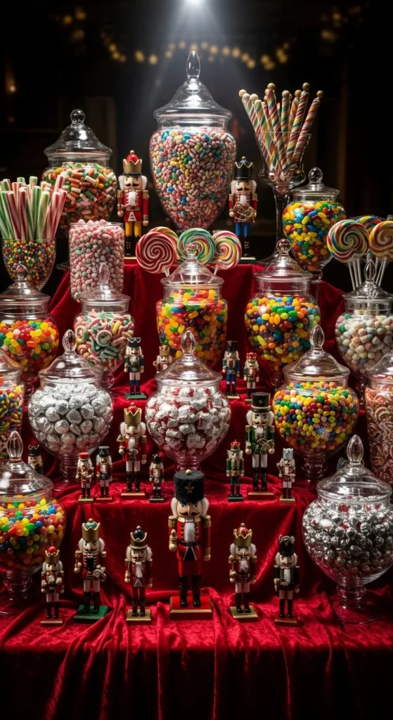 Add a Nutcracker theme for a playful, theatrical look. Use toy nutcrackers, velvet cloth, and red-gold decorations. Fill jars with colourful candies that match holiday costumes—reds, greens, blues. Thrifty tip: Use inexpensive toy soldiers from discount shops. This theme works especially well for holiday parties with children.