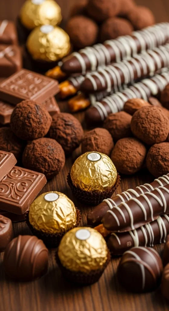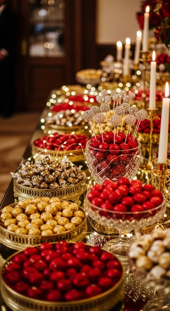 A chocolate-themed buffet always impresses. Set out truffles, chocolate-covered nuts, dipped pretzels, and small chocolate bars. Use gold or brown accents for a warm touch. To save money, mix premium chocolates with budget-friendly bulk varieties. Add a DIY touch by making your own chocolate bark with nuts or cranberries.