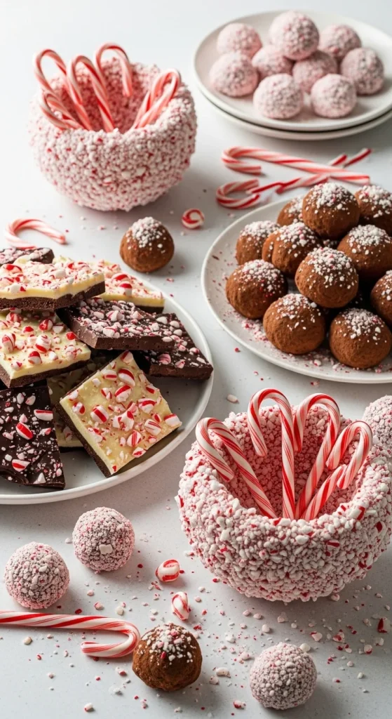 If you love minty treats, this candy bar is perfect. Use peppermint bark, peppermint truffles, crushed peppermints, and candy canes. Add white chocolate dips to complement the peppermint. DIY tip: break large peppermint bark slabs into small pieces to fill jars affordably. This table keeps flavours simple but very festive.