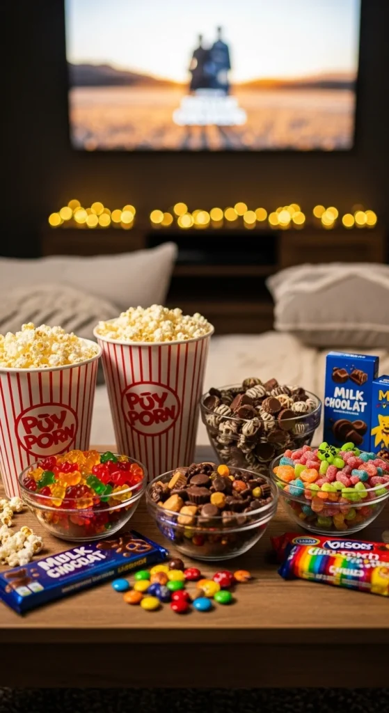Perfect for family gatherings or casual parties. Use movie-style snacks like popcorn, chocolate bites, sour gummies, and caramel peanuts. Fill large tubs for self-serving to keep refills easy. For a thrifty touch, use paper popcorn bags instead of glass jars. Add fairy lights to make the table feel more festive.