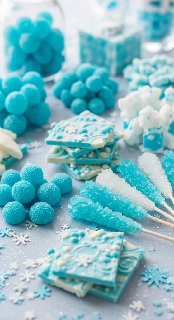 A blue-themed candy bar gives a cool winter atmosphere. Choose blue raspberry gummies, white marshmallows, coconut truffles, and blue rock candy. Use a white tablecloth and sprinkle faux snow for an icy effect. One affordable DIY idea is to spray-paint old jars in frosty white for a snowy look. If you want variety, mix blue foil-wrapped chocolates with white yogurt pretzels. This setup works well for evening parties because soft blue lights reflect nicely on the glass jars.