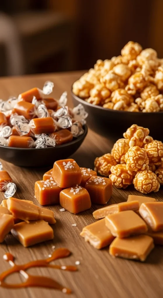 Caramel treats bring a warm, comforting flavour. Use caramel chews, caramel popcorn, toffee pieces, and soft caramel squares. Add brown paper bowls for a rustic touch. DIY tip: make your own toffee bark with nuts to stretch your budget. This table gives a rich holiday feel without needing too many items.