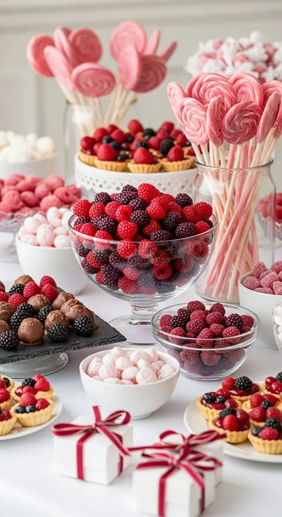 Berry colours add brightness to any candy buffet. Pick raspberry gummies, chocolate-covered berries, berry taffy, and berry rock candy. Use purple, red, and pink jars or ribbons for decoration. A budget idea is to mix real berries with candy for colour contrast. This theme feels lively and colourful.