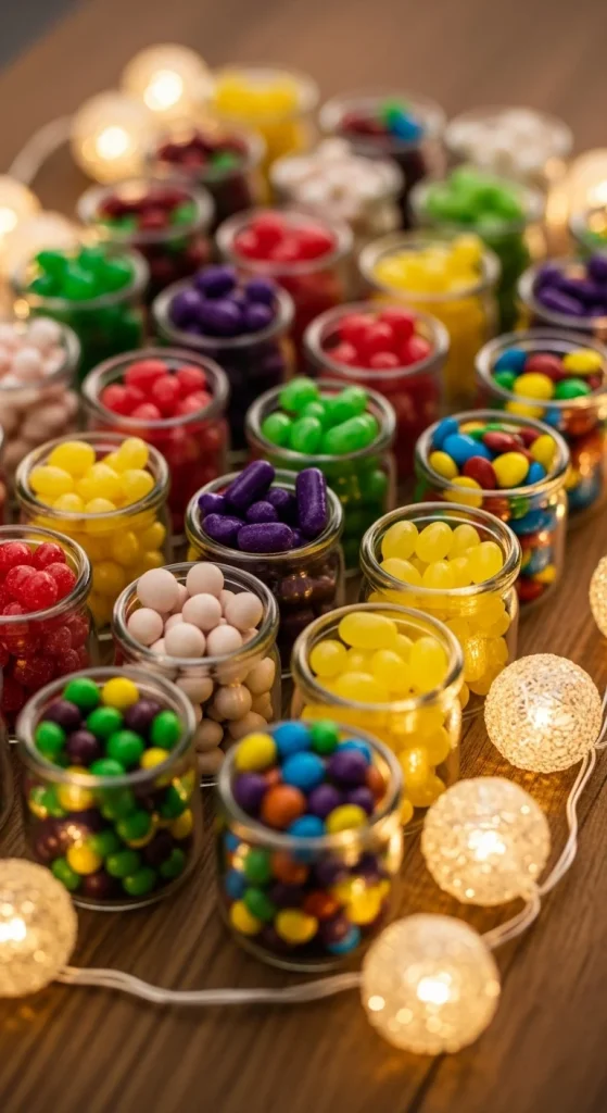Give each guest a mini jar to fill. Set out small jars and a variety of candies. This setup reduces crowding and keeps things tidy. Use inexpensive jars from discount shops or reuse baby food jars. Add simple ribbon ties for decoration.