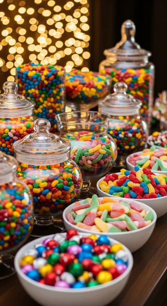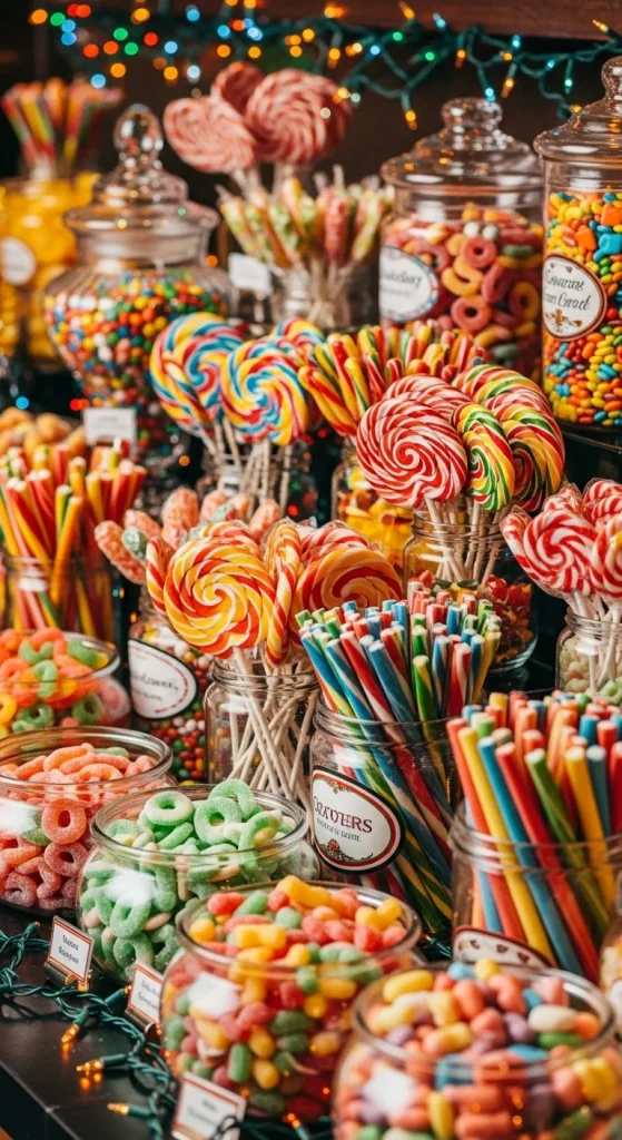 This theme celebrates colour. Fill jars with a mix of rainbow gummies, colourful chocolates, jelly beans, and striped taffy. Arrange the jars in a rainbow pattern for extra effect. DIY height boosters like wrapped boxes help create layers. This setup works for parties with kids, teens, or anyone who enjoys bright festive visuals.