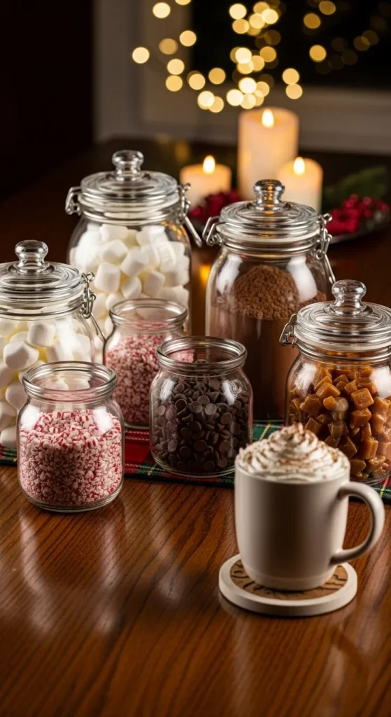 A hot cocoa candy station is perfect for cold evenings. Fill jars with marshmallows, chocolate chips, caramel bits, crushed peppermints, and cocoa powder. Add toppings like mini cookies, cinnamon sticks, and whipped cream. For a low-cost display, use mugs and bowls you already have instead of buying jars. A cute DIY option is to label toppings with handwritten kraft-paper tags. Guests enjoy making their own hot cocoa cups, so this station works well for family gatherings or winter game nights.