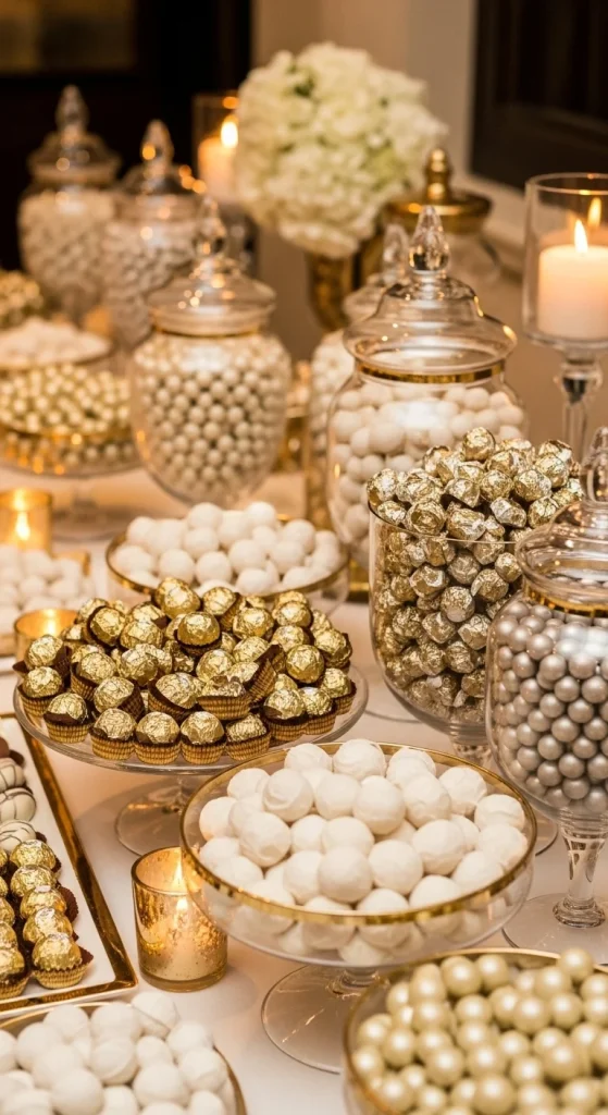 For a more polished look, choose a gold and white theme. Pick white truffles, gold-foil chocolates, pearl gumballs, and white fudge bites. Use tall glass jars and gold-rimmed trays to add charm. You can spray-paint old trays gold to save money. This setup works beautifully for formal holiday dinners or office events.