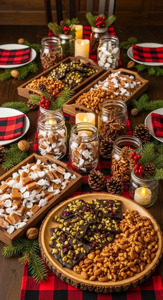 A rustic candy buffet feels cosy and warm. Use wooden crates, plaid runners, mason jars, and earthy tones. Candies like caramel chews, chocolate bark, toffee pieces, and spiced nuts match the theme. Use pine branches or cinnamon bundles as decoration. Repurpose old wooden boxes for height instead of buying new stands.