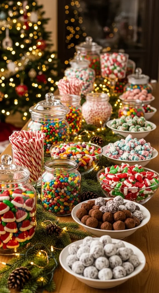 A green-themed candy bar inspired by the Grinch adds fun to the holidays. Use green jelly beans, lime gummies, sour apple sticks, and green popcorn. Add a few playful decorations like Grinch-style eyes or green ornaments. DIY idea: paint old jars green and add fluffy white cotton around the lids. This table stands out because green candy naturally pops.
