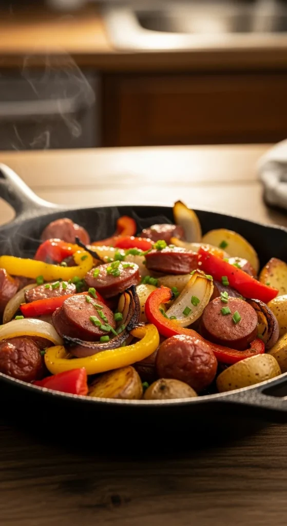 A sausage skillet cooks quickly and fills the kitchen with cosy aromas. Dice potatoes, onions, and peppers. Add sliced sausage and sauté until browned. Season lightly. This meal works well when you want something hearty without long prep. Use whatever vegetables you already have. It’s an easy one-pan dish that cooks fast.
