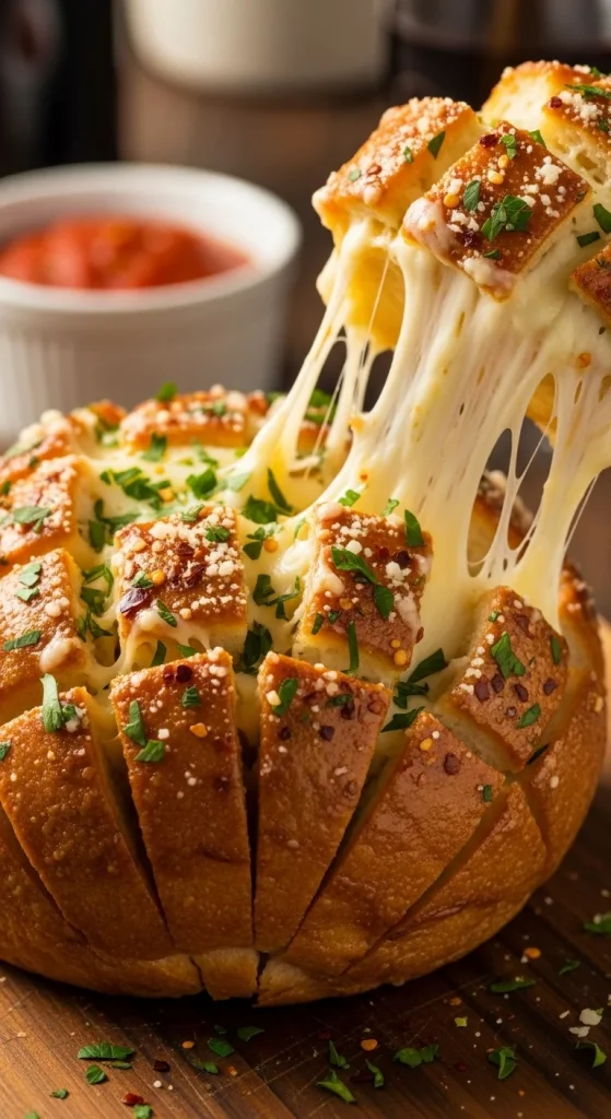 Pull-apart bread works great for sharing. Slice a loaf in a crisscross pattern and fill with garlic butter and cheese. Bake until melted. This is an easy appetizer or side dish for holiday meals. Use any cheese you already have. Serve hot so the pieces pull apart easily.