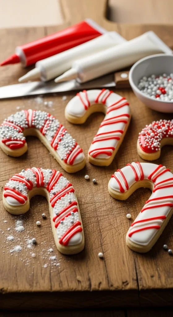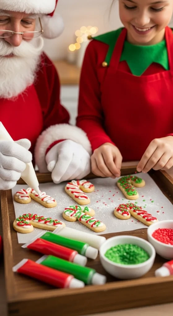 Simple yet festive. Include striped candy cane cookies and icing in red and white. Add edible glitter or sanding sugar for shine. Kids can swirl the colors or make patterns easily.
