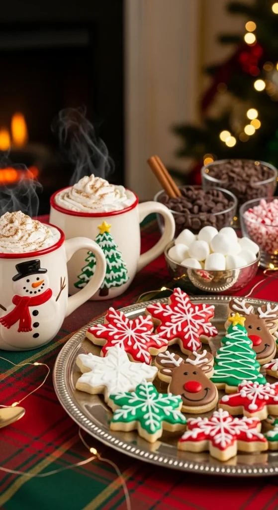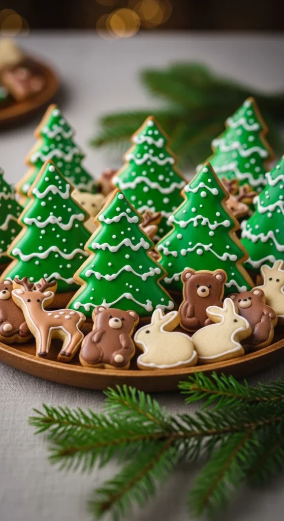 Bring nature to the table. Include tree, fox, and deer-shaped cookies with green icing, white “snow” sugar, and cocoa powder for accents. Great for adults who want something earthy yet festive.