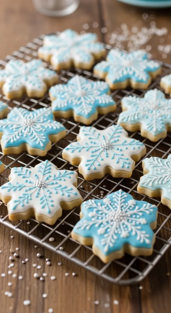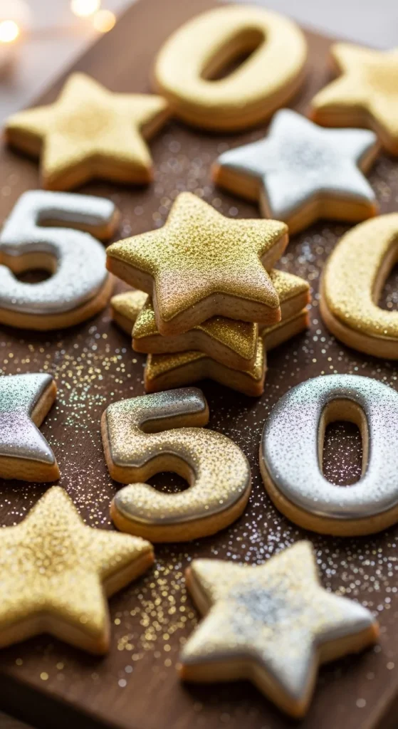 Keep the celebration going past Christmas. Include star, clock, and number “2025” cookies. Add gold and silver icing, edible glitter, and pearl sprinkles. A festive way to ring in the new year with sparkle.