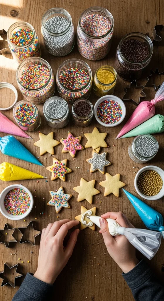 A timeless choice. Include plain sugar cookies shaped like stars, trees, and stockings, plus small piping bags of red, white, and green icing. Add sprinkles, mini candies, and edible pearls. Use resealable containers for easy cleanup. You can bake cookies ahead or buy pre-cut dough to save time.