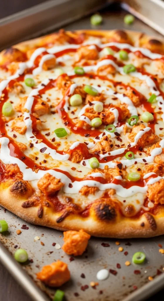 Spice up your holiday dinner with this tangy pizza. Spread buffalo sauce, add shredded chicken, mozzarella, and bake. Top with ranch drizzle and sliced green onions. It’s a party favourite — affordable and quick to make for game nights.