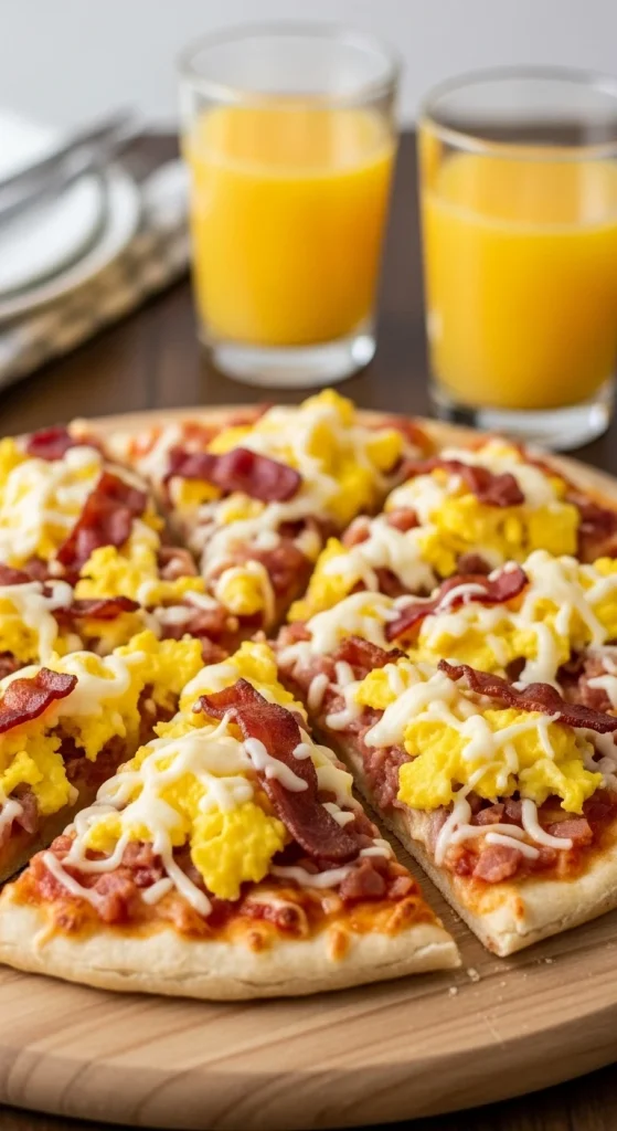 Spread white sauce or cream cheese, top with scrambled eggs, bacon, and shredded cheese. Bake until bubbly. It’s a fun brunch idea for Christmas morning. Use pre-made crusts or naan to keep it easy and affordable.