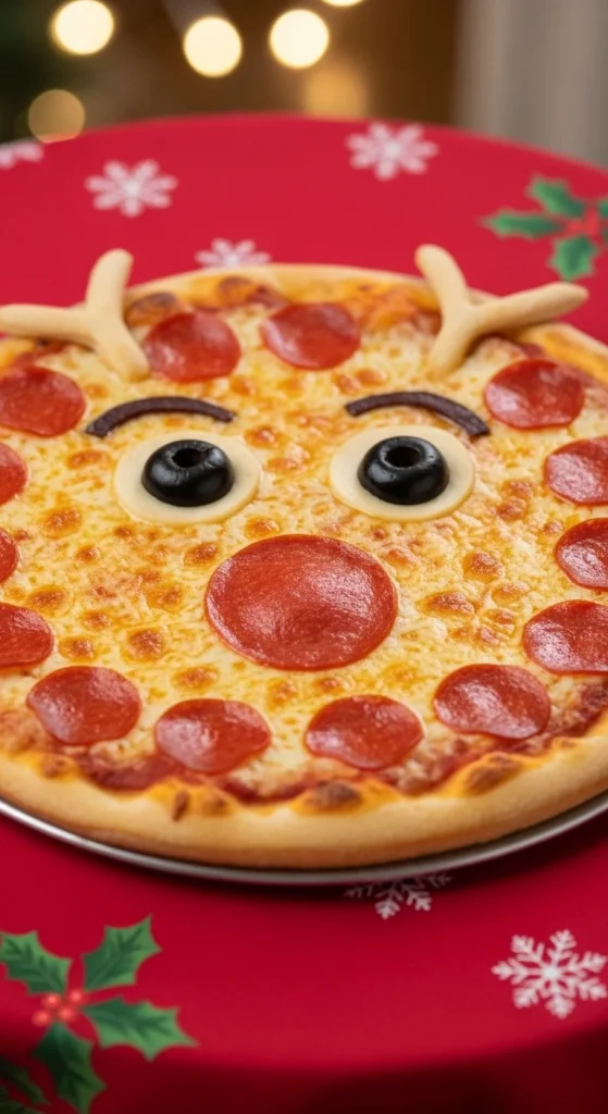 Make dinner fun for kids! Shape your pizza into a circle, then use pepperoni for the nose, olives for eyes, and breadstick “antlers.” It’s simple but brings smiles to the table. Perfect for family pizza night before Santa arrives.