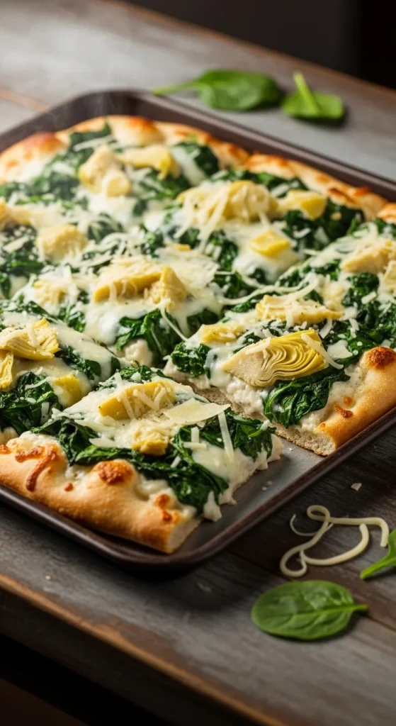 Combine cream cheese, spinach, artichoke hearts, and garlic. Spread on dough, top with mozzarella, and bake. It’s creamy, cheesy, and crowd-pleasing. Perfect for potlucks or holiday gatherings. Save money by using frozen spinach — works just as well.