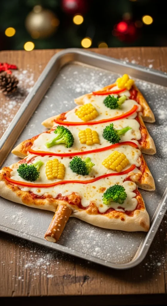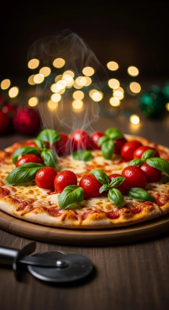 Classic and elegant. Use tomato sauce, mozzarella, and basil, but arrange the basil in a circle to look like a wreath. Add cherry tomato halves for “holly berries.” It’s easy, affordable, and always a hit at holiday dinners.