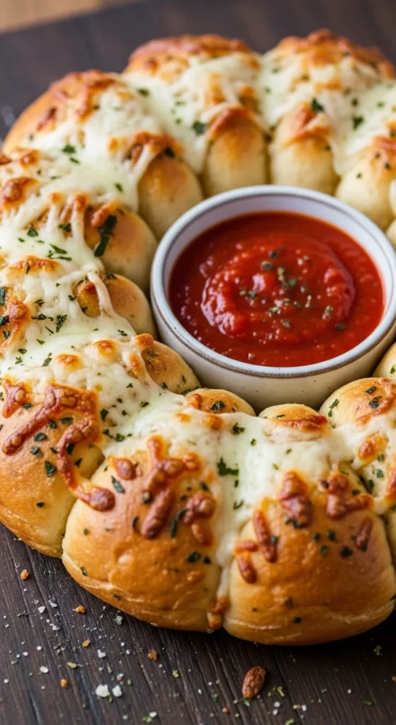 Arrange small dough balls filled with cheese in a circle to form a wreath. Brush with garlic butter and bake. Serve with marinara in the centre for dipping. It’s beautiful and shareable, perfect for parties or family dinners.
