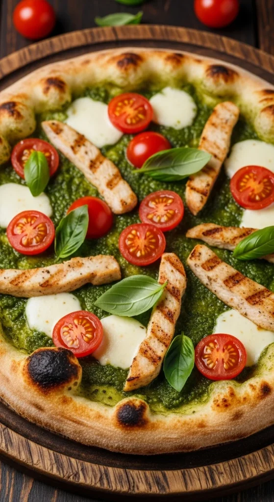 Spread pesto instead of tomato sauce, add grilled chicken and cheese. The green and red colours fit perfectly for Christmas. Bake until golden, then drizzle olive oil on top. It’s vibrant, simple, and tastes like something from a café.