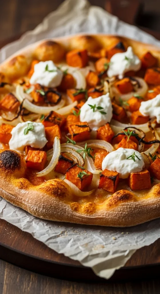This sweet and savoury pizza feels fancy yet simple. Roast thin slices of sweet potato, layer them with onions, goat cheese, and a light honey drizzle. It’s great for vegetarians or anyone who loves rich flavours. Add thyme or rosemary for aroma.