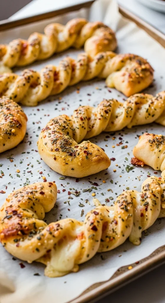 Twist pizza dough with mozzarella and marinara inside, then shape into candy canes. Brush with garlic butter before baking. These are fun for kids to make and eat. Serve with extra dipping sauce on the side — perfect for holiday movie nights.