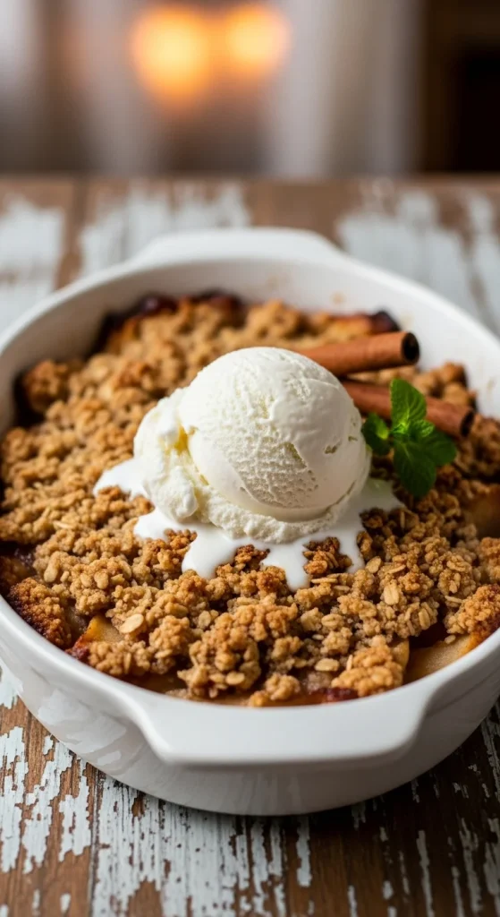 Sweet apples, crunchy topping, and cinnamon warmth. Slice apples and toss with maple syrup and cinnamon. Top with oats, nuts, and coconut oil. Bake until bubbling. Serve with vegan ice cream or whipped topping.